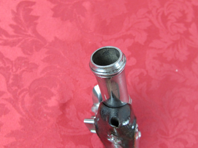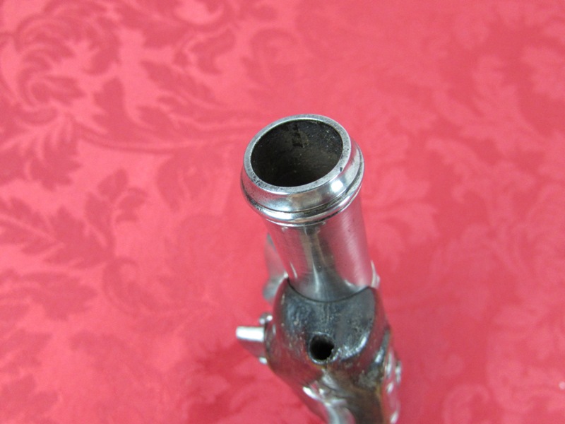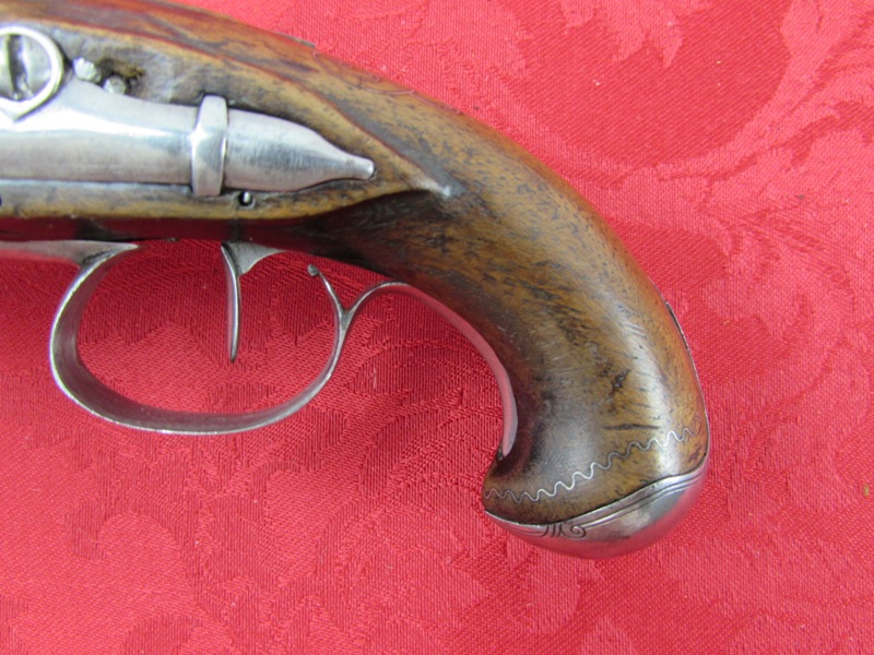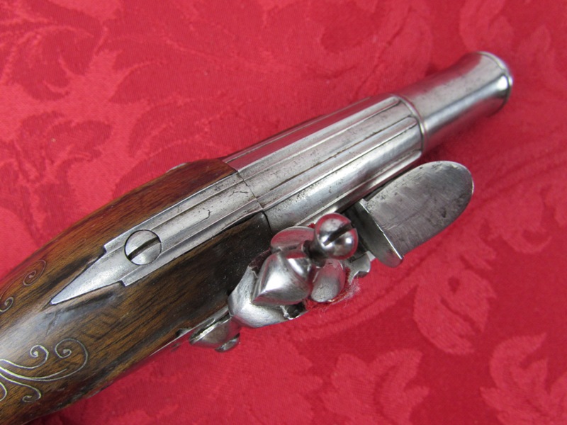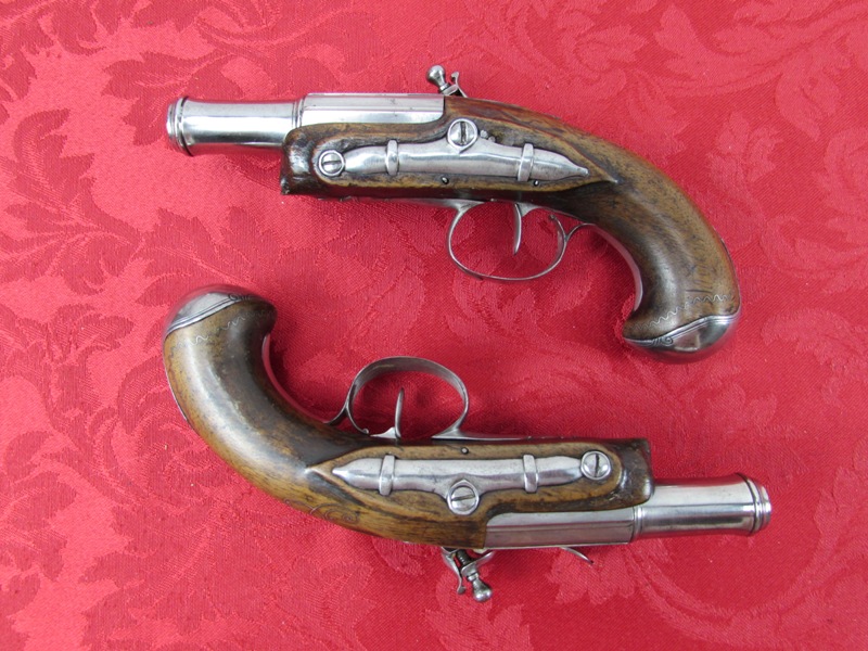 In fine overall condition. 100% authentic.  6 3/4inch overall length. Nice 3 ¼ inch ribbed barrels. No visible markings. Fine to excellent lightly cleaned metal. Excellent actions. Fine bores. Fine stocks with a nice inlaid silver wire décor. No ramrods. A very attractive flintlock pair! Free shipping.