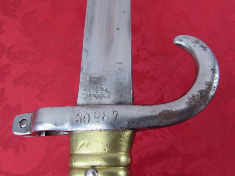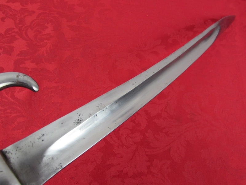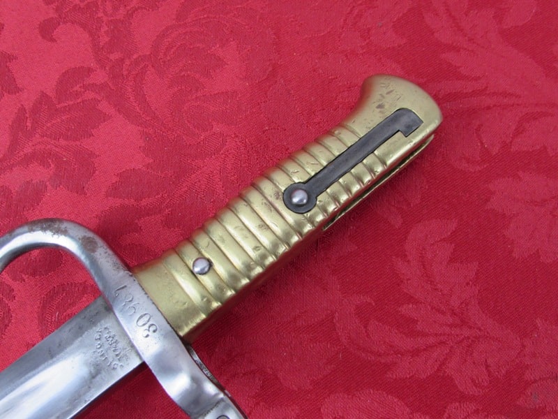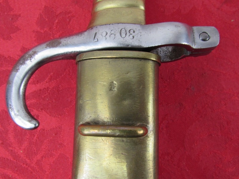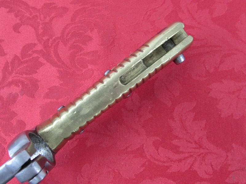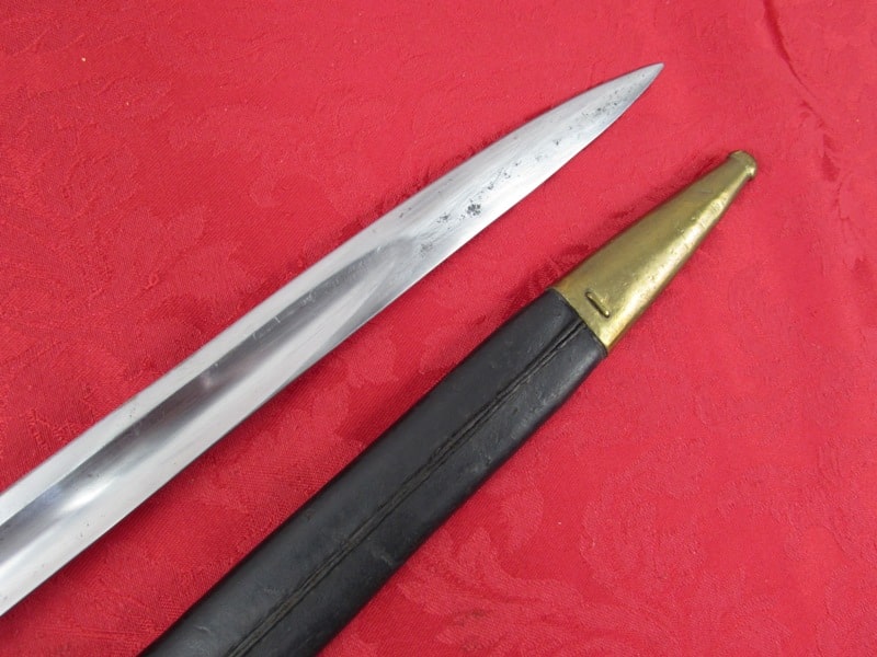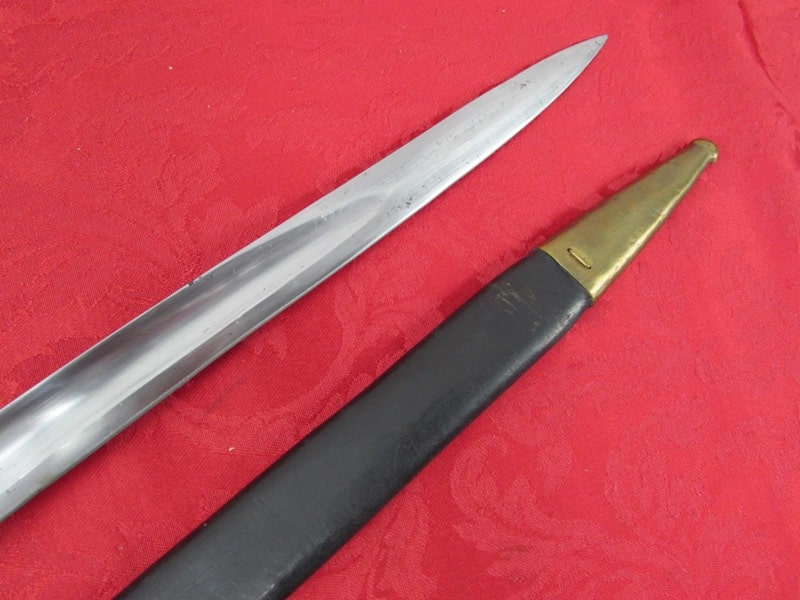 In very good general condition. 23 ¼ inch overall length. 17mm inside socket diameter. Very good 18 ¼ inch blade with light ricasso markings. Unit marked on cross guard. Solid brass grip with functional push button release. In its very good original brass mounted leather scabbard. Free shipping.