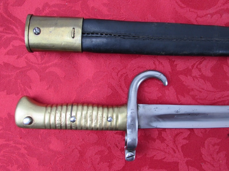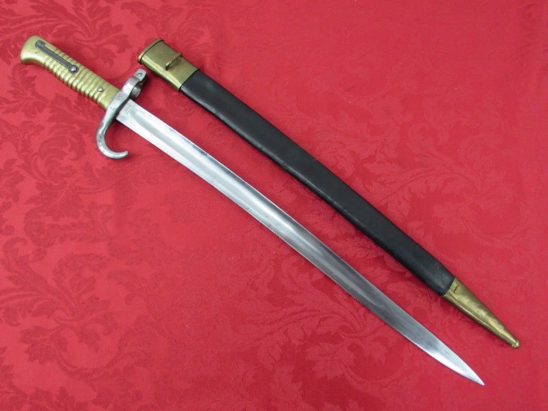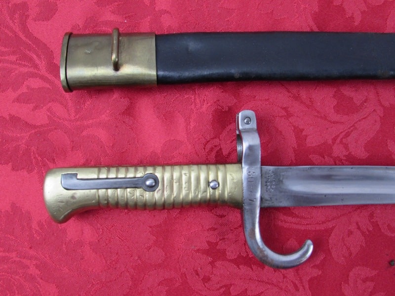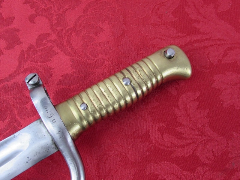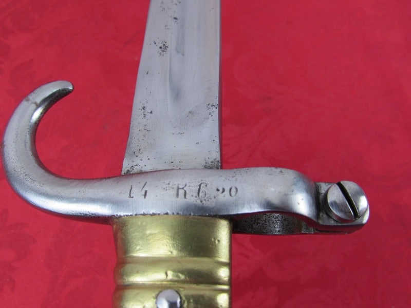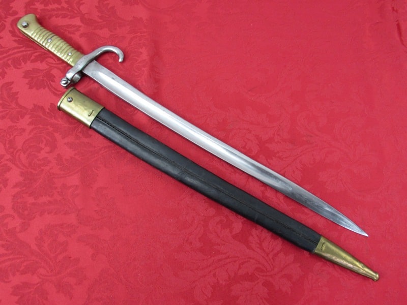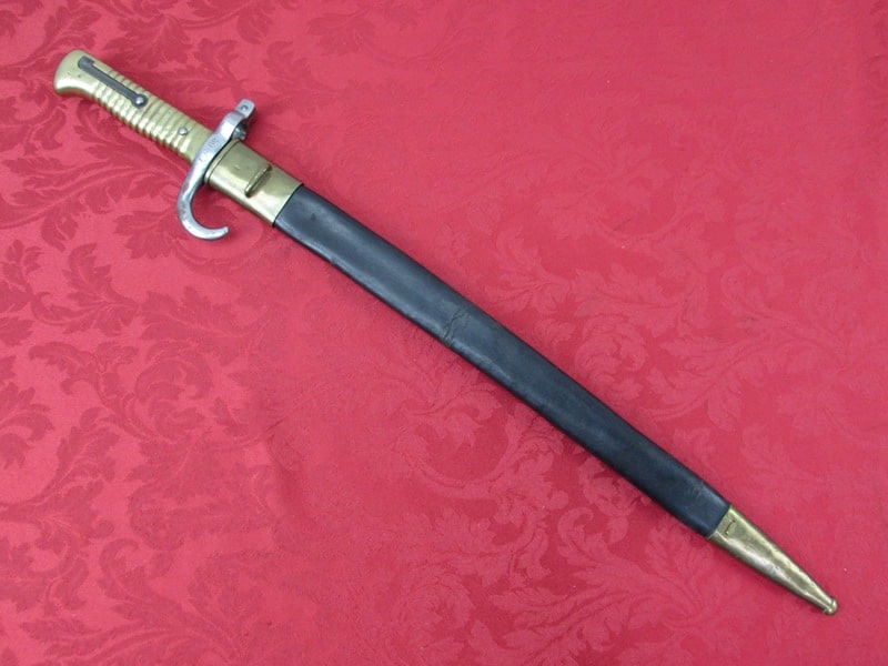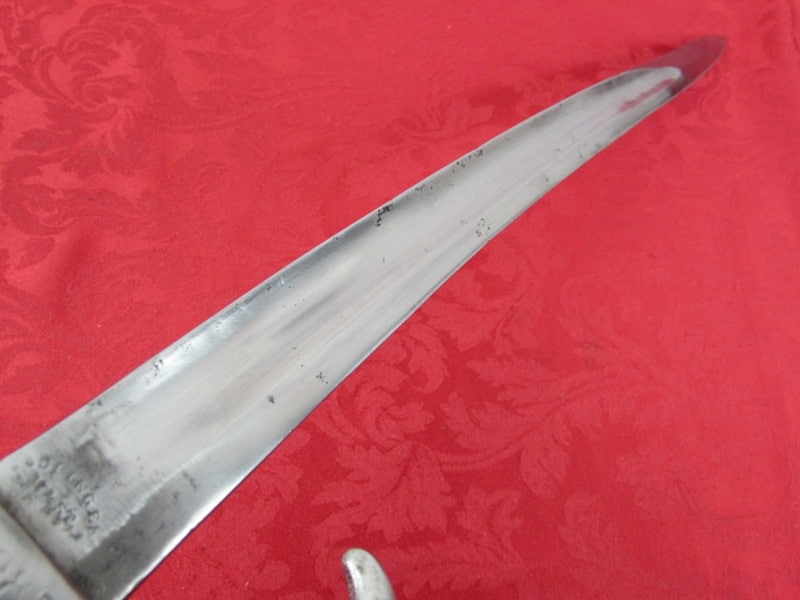 In very good general condition. 23 ¼ inch overall length. 17mm inside socket diameter. Very good 18 ¼ inch blade with light ricasso markings. Unit marked on cross guard. Solid brass grip with functional push button release. In its very good original brass mounted leather scabbard. Free shipping.